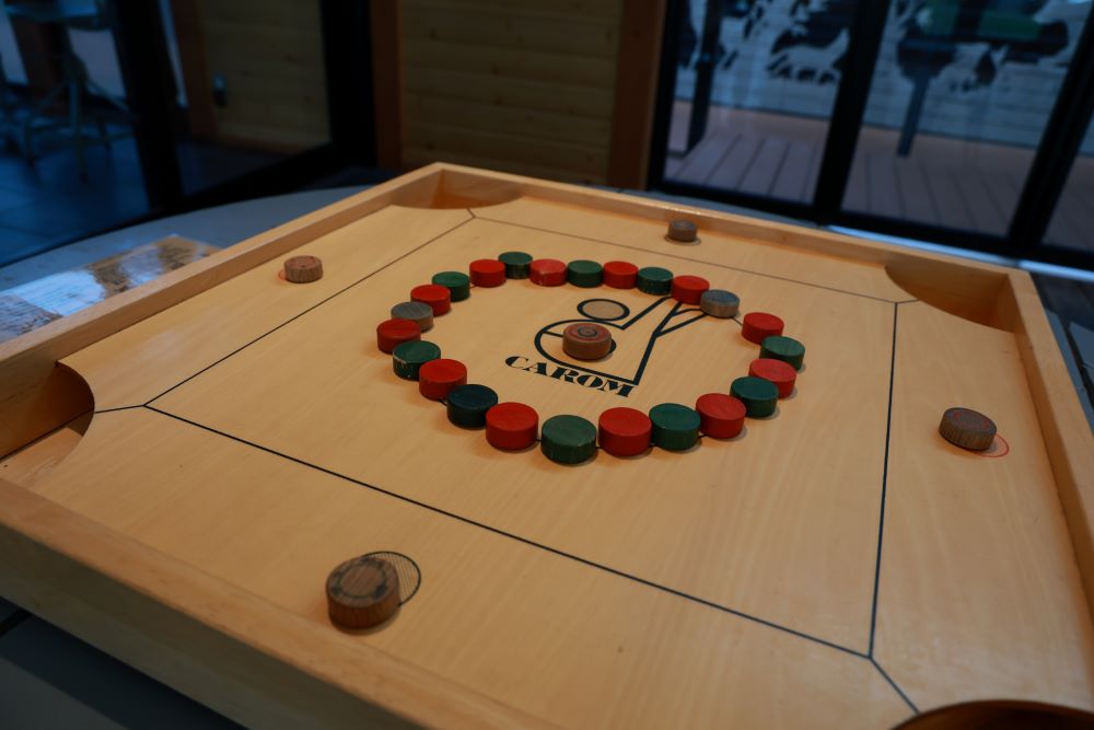 別エリアにバーもあるし、彦根の伝統的ゲーム、カロムもありました。(みんな知ってる?私は初耳ゲームでした。)
