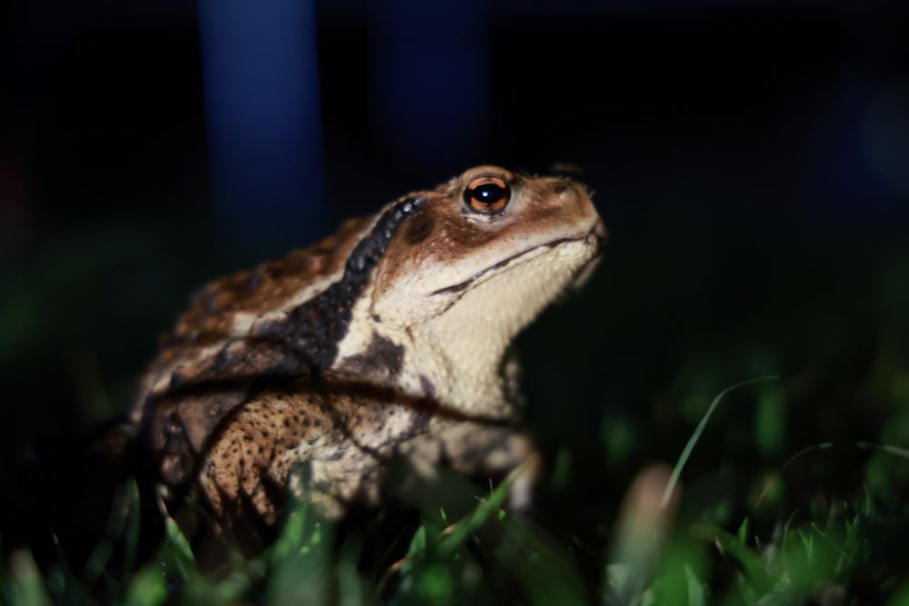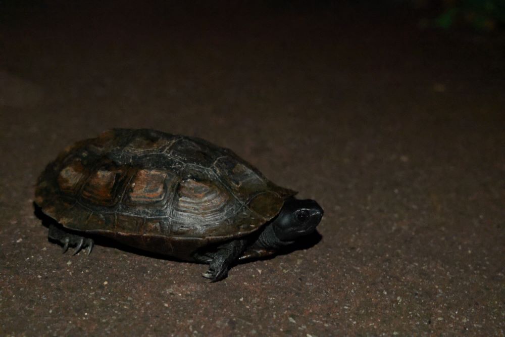 暗い中のそのそ歩くカメと近寄っても逃げないカエルに出会いました笑