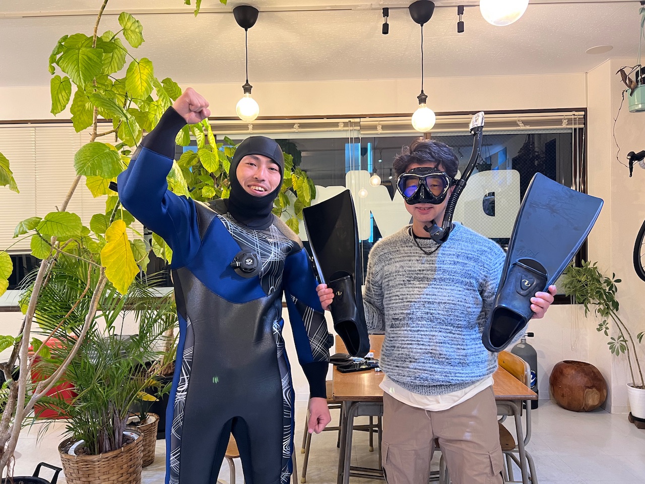 ハセヤン、キョウサンの器材たちが届いた!これが二人のこれからの相棒だ!器材は命を守ってくれるのにすごく大事な存在だ。海を相手にしているからこそ危険もある。できるだけ安全に潜るために自分に合った器材を使っていく、一番大事です!!マイ器材たちを大事に使い古していこう。二人とも次回の海楽しみにしときなはれ!