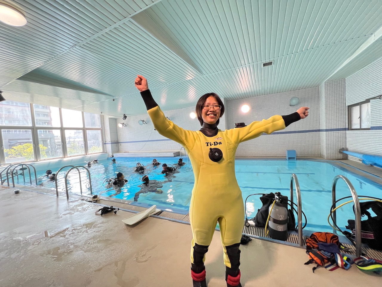 ちあきのプール講習に行ってきた!初めてのダイビングやのにビビらずめちゃくちゃ楽しむ、できる系ダイバーですわ。ここからダイバーちあきが誕生します!みんな仲良くしてな―!